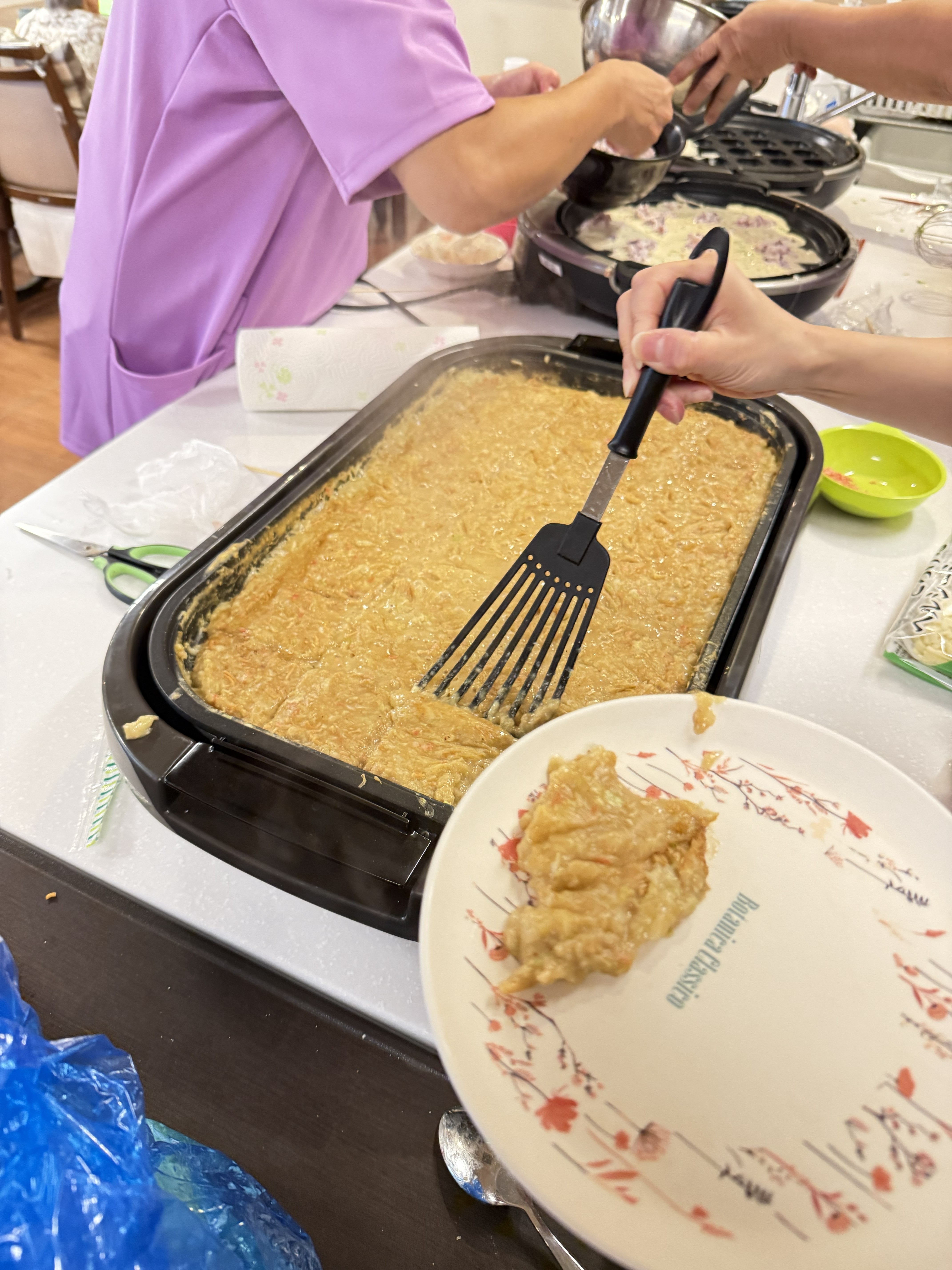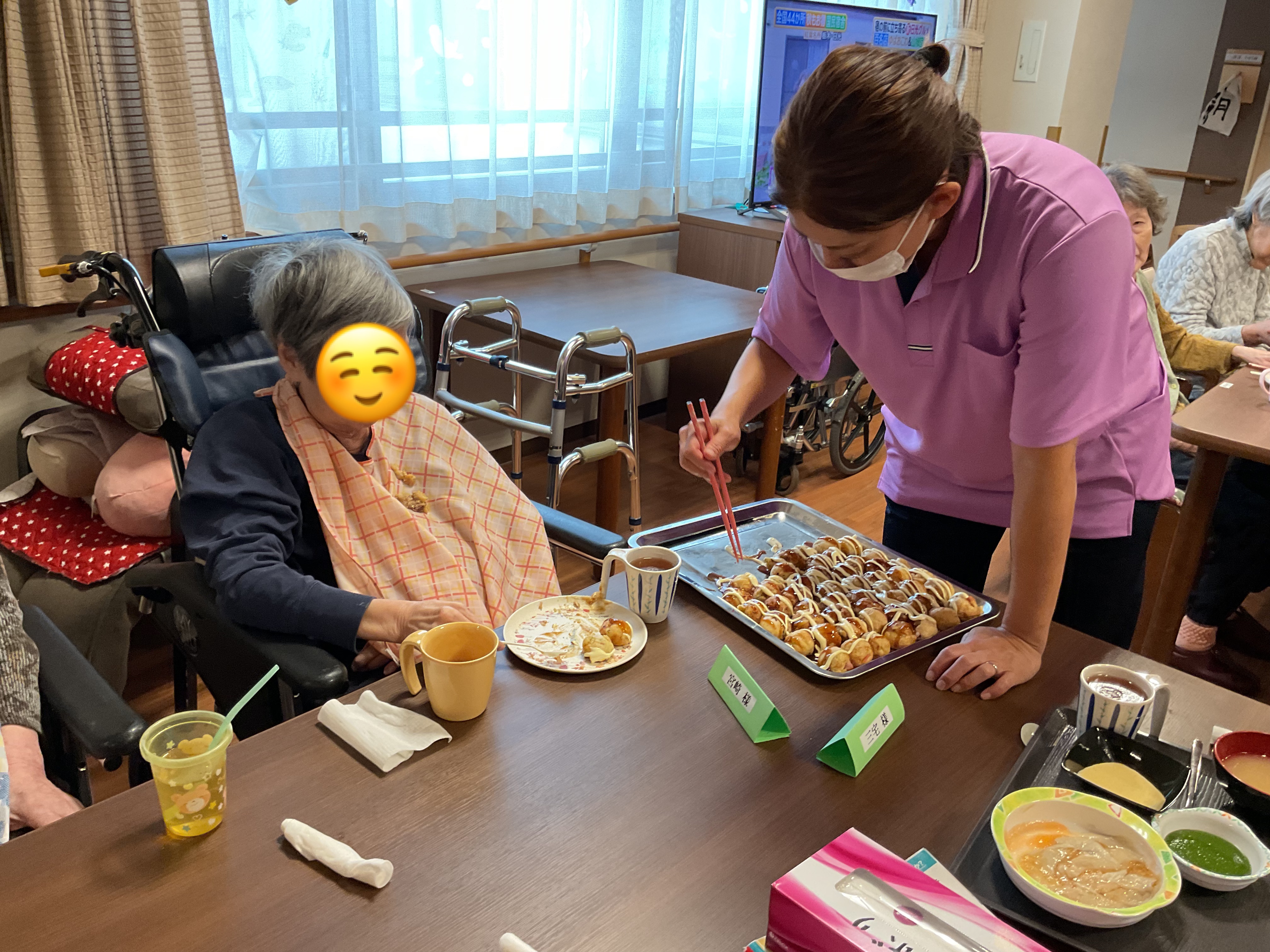 4階 陽和合同で、たこ焼き&もんじゃパーティーを昼食時に行いました。特にたこ焼きは、大人気で「おかわりください!」と何度もおかわりされている方もいらっしゃいました!