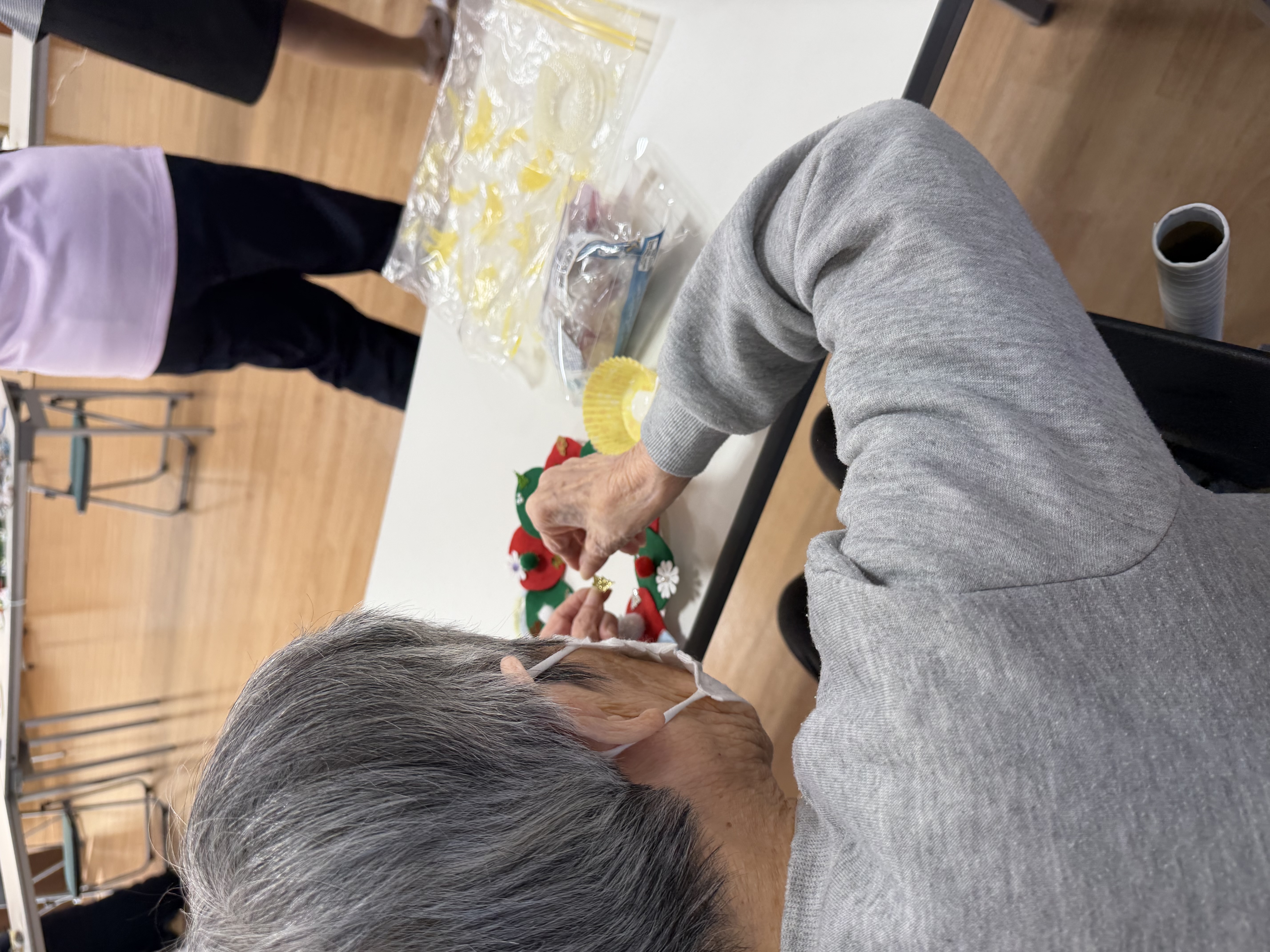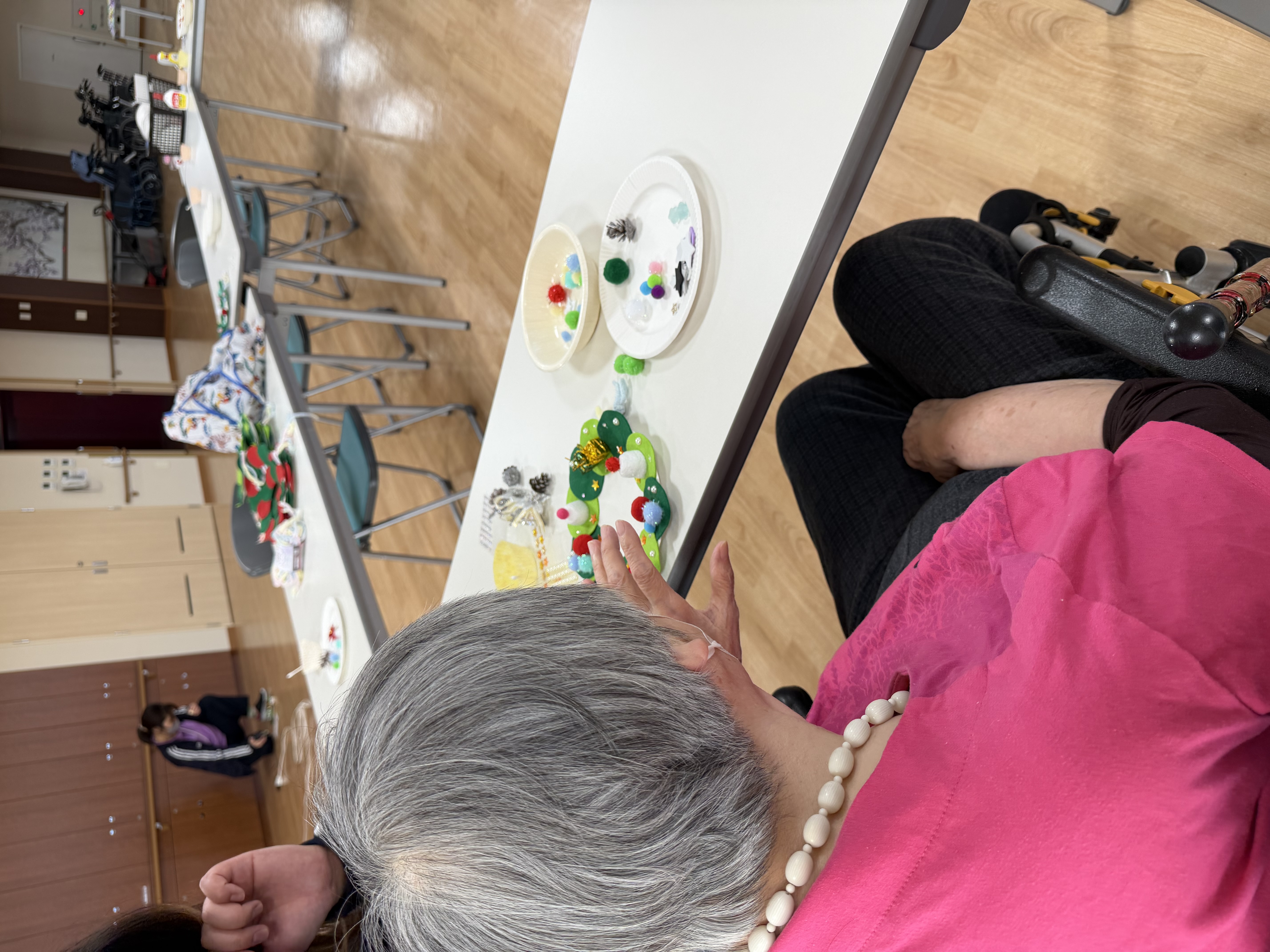 紙皿とフェルトで土台を作り、入居者様がそれぞれでリボンや鈴などをつけてオリジナルのクリスマスリースを作成しました!